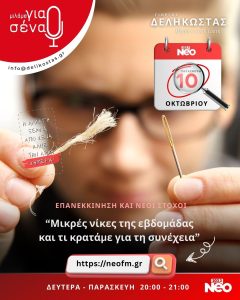 Η πέμπτη εκπομπή της εβδομάδας, με τίτλο «Μικρές νίκες της εβδομάδας – και τι κρατάμε για τη συνέχεια», ολοκλήρωσε τη θεματική «Επανεκκίνηση και Νέοι Στόχοι». Ο Γεώργιος Δεληκώστας πρότεινε μια διαφορετική προσέγγιση: αντί για νέο υλικό, κάλεσε τους ακροατές να κάνουν μαζί του μια ανασκόπηση, να δουν τι πραγματικά κρατούν και πώς μπορούν να εφαρμόσουν όσα άκουσαν στην καθημερινότητά τους.